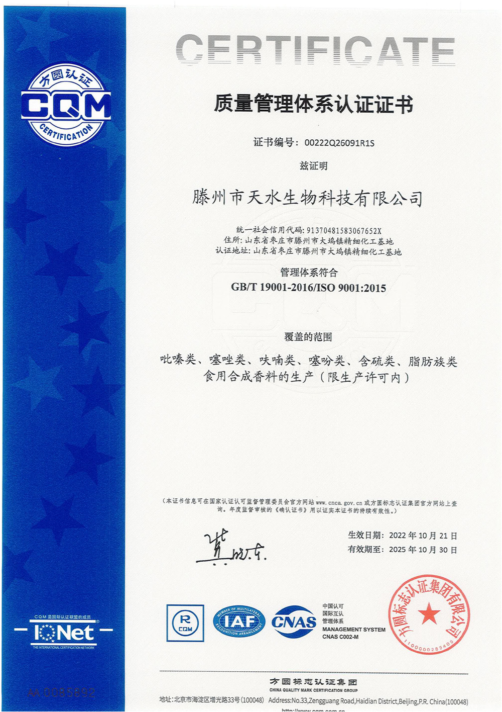 滕州市天水生物科技有限公司成立于2011年9月,是目前國(guó)內(nèi)雜環(huán)類(lèi)合成食品香料、日化香料和醫(yī)藥中間體生產(chǎn)經(jīng)營(yíng)的綜合性企業(yè)。坐落于山東省滕州市生物醫(yī)藥產(chǎn)業(yè)基地,總投資5000余萬(wàn)元,占地面積約30000平方米,員工百余人。公司先后被評(píng)為高新技術(shù)企業(yè)、專(zhuān)精特新中小企業(yè)、科技型中小企業(yè),建有市級(jí)重點(diǎn)實(shí)驗(yàn)室1處,并先后獲得ISO9001質(zhì)量體系認(rèn)證、ISO22000食品安全體系認(rèn)證、kosher認(rèn)證和Halal認(rèn)證。是香精香料及食品配料協(xié)會(huì)會(huì)員單位及滕州市中小企業(yè)協(xié)會(huì)理事單位。